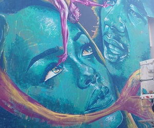 D’un côté de la rue, rencontre avec Mlle Belamour qui a peint 2 femmes créoles reliées par leur chevelure, ici encore le travail est parfait, le rendu magnifique !