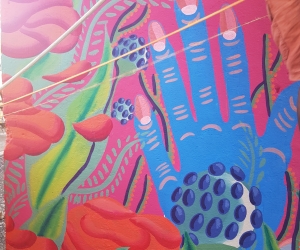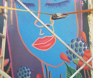 On traverse la route et c’est Jessica LLau perchée sur son escabeau qui se présente et me parle de son art. Elle a choisi de faire une représentation de la Vierge, icône qui lui parle ces temps-ci. Elle en a fait une représentation naïve haute en couleurs et c’est une véritable réussite ! Je veux la même chez moi !!!!