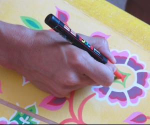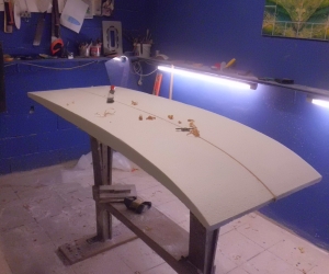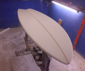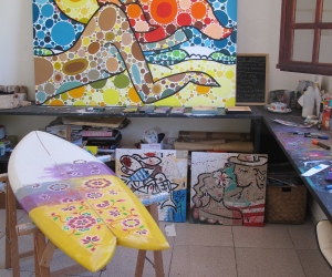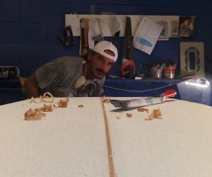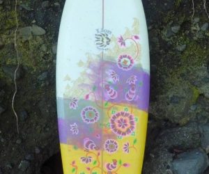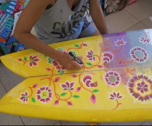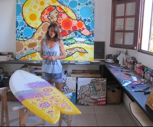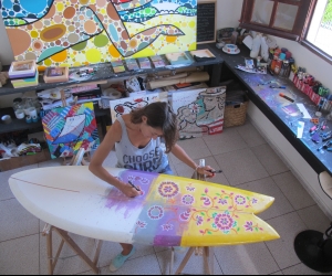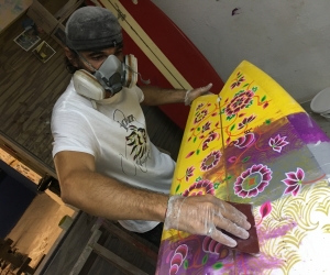Portrait d'une oeuvre à 4 mains, fruit de la collaboration entre l'artiste voyageuse Celine CHAT et le Shapeur Basse terriens Lyonel dit LIONSHAPE. 2e oeuvre en commun pour ce duo d'artiste reuni par leur passion du surf.