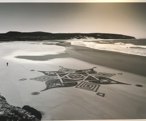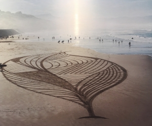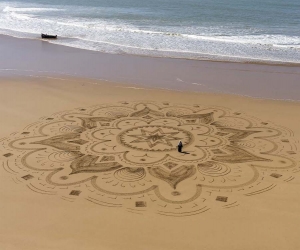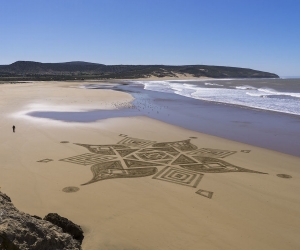 Sam is one of the few artists in the world and pioneer in France since 2008 to practice beach art, some land art similar to ephemeral graffiti made with the unique help of a rake at low tide on the beautiful beaches that he travels around the world. His huge sand drawings are inspired by the country he visits, its culture (Moroccan zelliges, Portuguese azulejos ...), the direct environment or simply improvised. Once the work is finished, comes a second work, photographic this time, allowing him to create a lasting work and tell a new story in which the poetry of the moment takes its place, sometimes just in a detail, representing the fragile beauty of our environment and makes us stop and reflect on the magic of the moment, our relationship with nature and the very essence of our beings