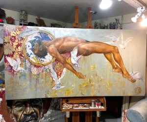 His art career really starts In 2004 when he left Antigua in order to pursue a BFA in Studio Art at the Barbados Community College, where his portfolio grew to include film and Printmaking. In 2007 he was awarded a National Youth Award for his contribution to the Visual Arts and from this time he has been exhibited in many countries. His work on the question of slavery has been seen all over the world. Mark Brown is a figurative painter who take his inspiration from his heri- tage, his religion and the questions he has about life, choices and journeys.