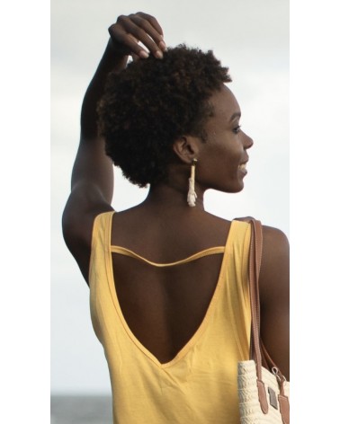 Derriere : légèrement en pointe plongeant, empiècement lanière sur haut du dos